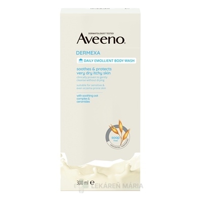 Aveeno Dermexa Emolienčný sprchovací gél upokojuje a chráni veľmi suchú, svrbiacu pokožku, čistí jemne bez vysušovania – klinicky preukázané. Vhodný na veľmi suchú, citlivú pokožku a tiež na pokožku so sklonom k vzniku ekzému.