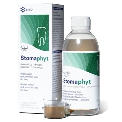Bylinná ústna voda Stomaphyt je určená na každodennú starostlivosť o ústnu dutinu. Obsahuje extrakty repíka lekárskeho, rumančeka pravého a šalvie lekárskej. Je vhodná pre osoby so zvýšenou tvorbou povlaku, nositeľov zubných protéz, mostíkov a koruniek. Vyniká