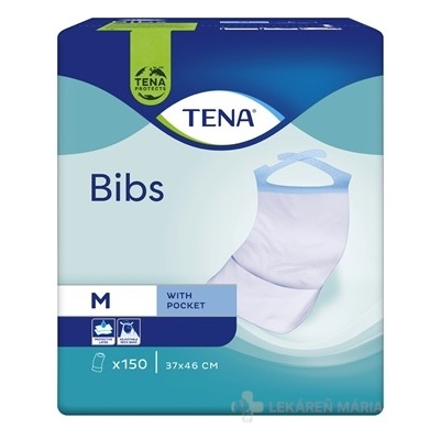 Podbradníky TENA Bib sú užitočné jednorazové obrúskové podbradníky so zabudovanými prednými vreckami a zadným uťahovaním na dôstojnú a hygienickú ochranu počas jedla.